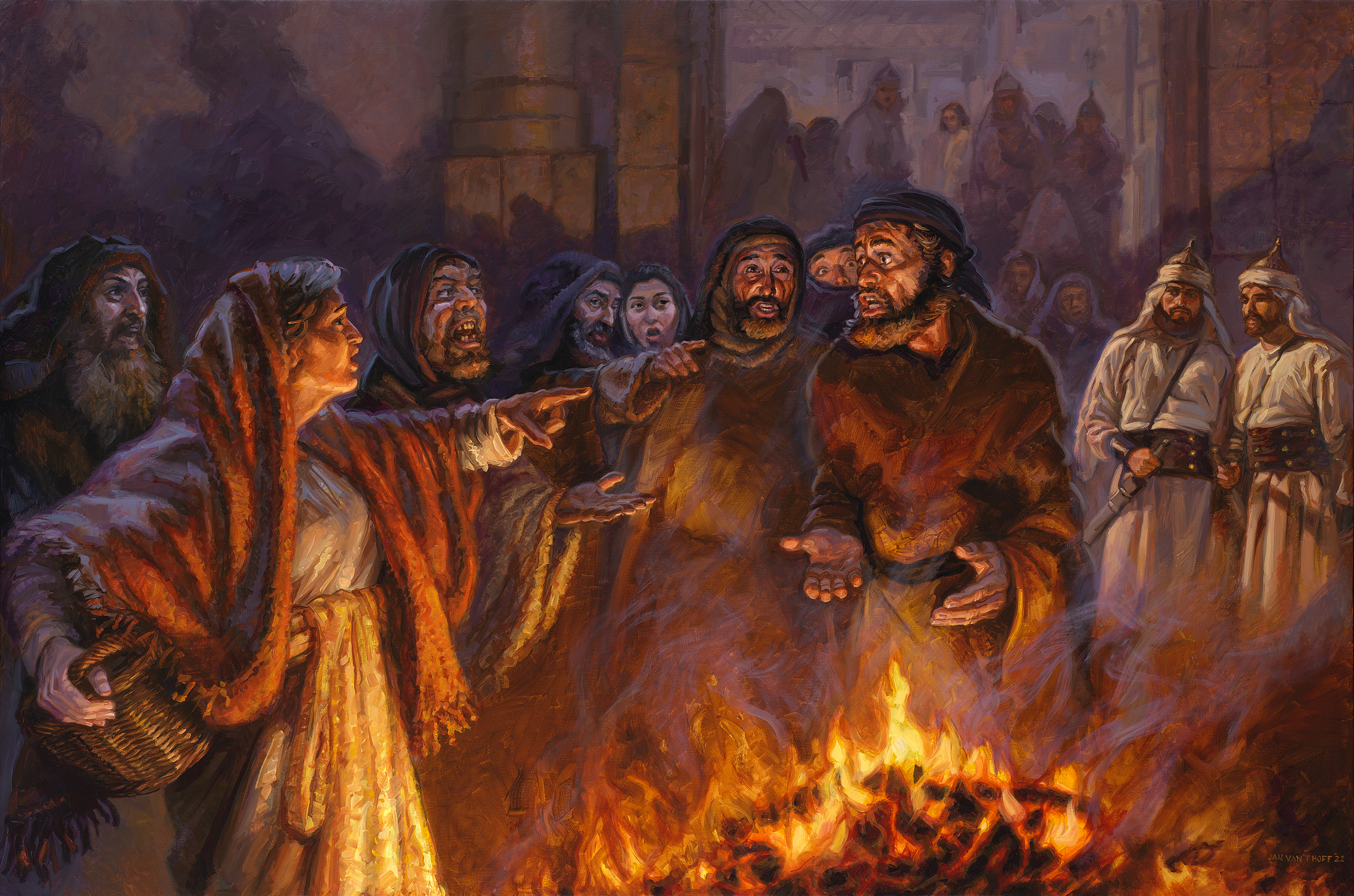 No mucho después, Jesús es llevado cautivo en el jardín de Getsemaní. Lo llevan a la casa del sumo sacerdote para interrogarlo. Pedro lo sigue de lejos, al patio de la casa. Hay un fuego de carbón ardiendo. Es una noche fría. Pedro es reconocido por varias personas como discípulo de Jesús, pero él niega conocer a Jesús tres veces.