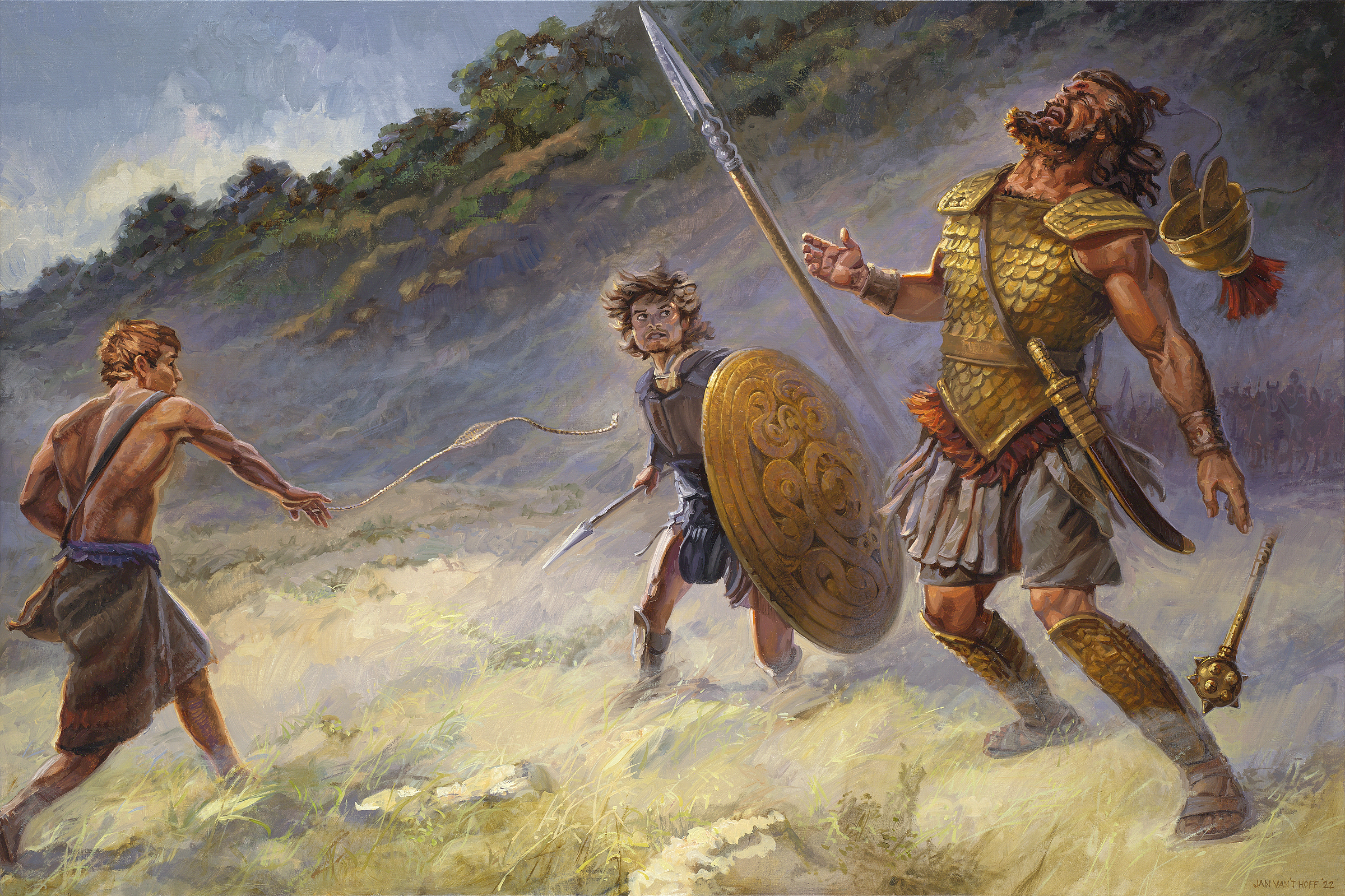 La batalla contra Goliat - que viste una armadura escamosa y que recibe un golpe fatal en la cabeza – hace pensar en Génesis 3 versículo 15. Allí se promete que el descendiente de Eva heriría la cabeza de la serpiente. Esa promesa se cumplió en Jesús, el Hijo de David, quien hirió la cabeza a Satanás, "la serpiente antigua" (Apocalipsis 12 versículo 9) en el Calvario, aunque Su apariencia exterior era débil. La lucha de David contra Goliat presagió esto. Fue una batalla espiritual por el honor del nombre de Dios. En la batalla espiritual que aún queda por librar, los cristianos pueden vencer solamente y exclusivamente gracias al poder de Dios.