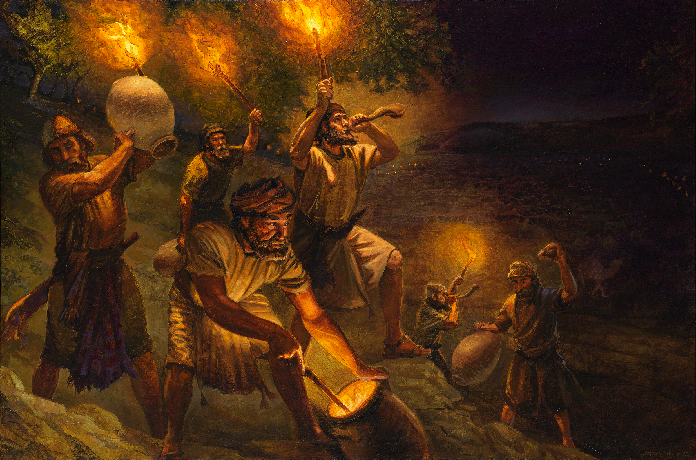 Cuando los hombres de Gedeón - divididos en tres grupos de cien - a medianoche rodean los madianitas y les aterrorícen con sus trompetas, antorchas, gritos de guerra, y el sonido de vasijas de barro que se rompen, el SEÑOR asusta tanto a los madianitas, que luchan entre sí y huyen.