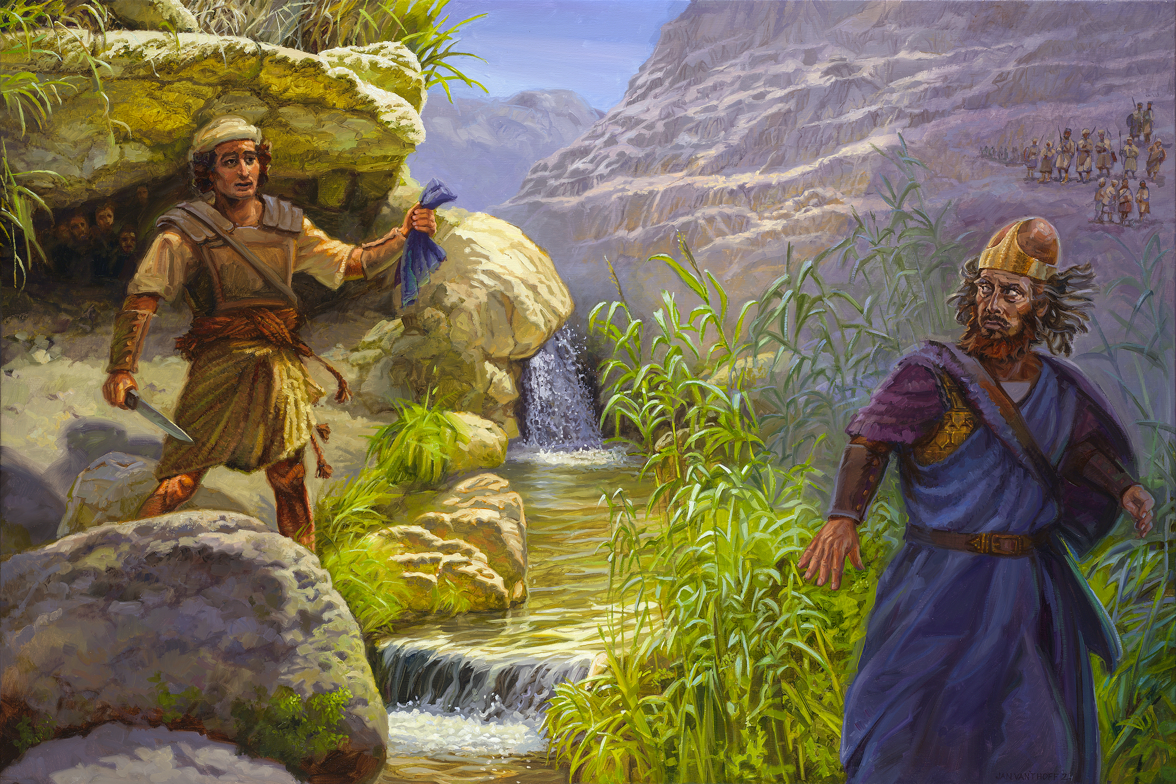 Saúl lo persigue con 3.000 de sus mejores soldados. David y sus hombres están escondidos en una gran cuava. Es precisamente en esa caberna donde Saúl viene a hacer sus necesidades.