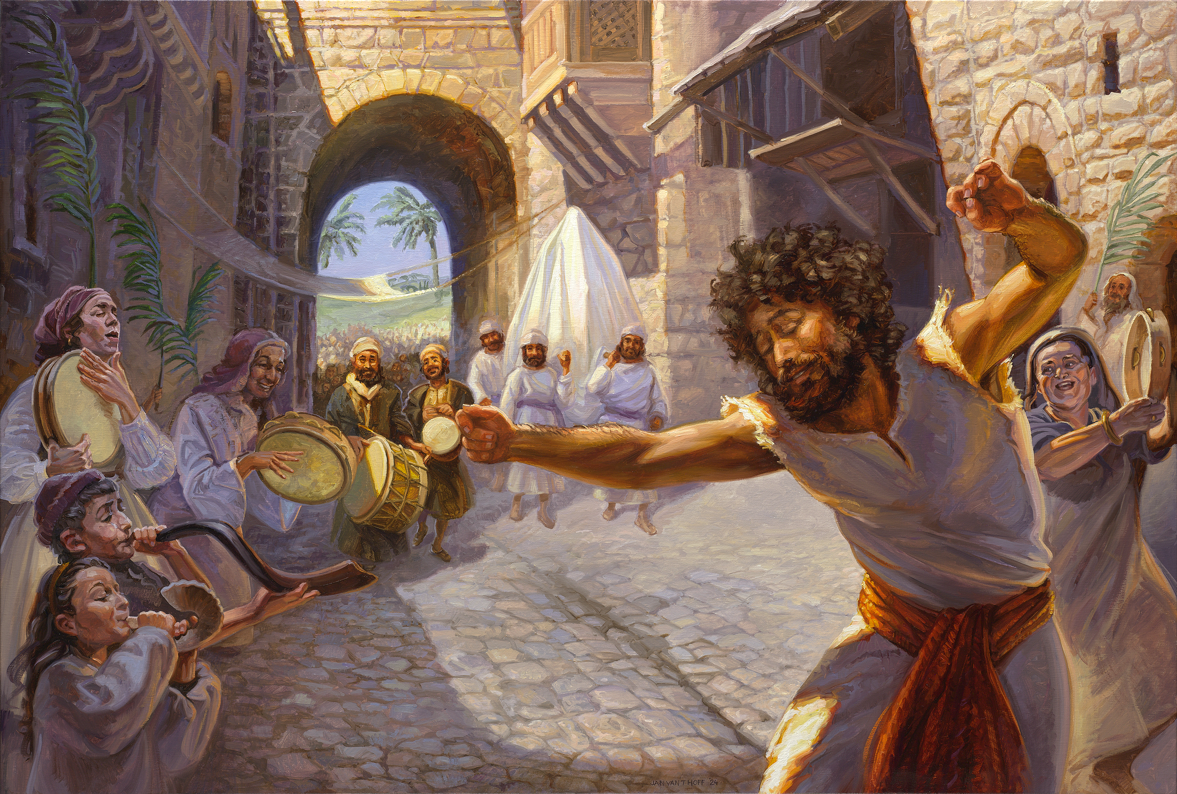 En el cuadro el énfasis está en la experiencia de alegría de David, en presencia de Dios y frente a la gente común. Véase el versículo 22.