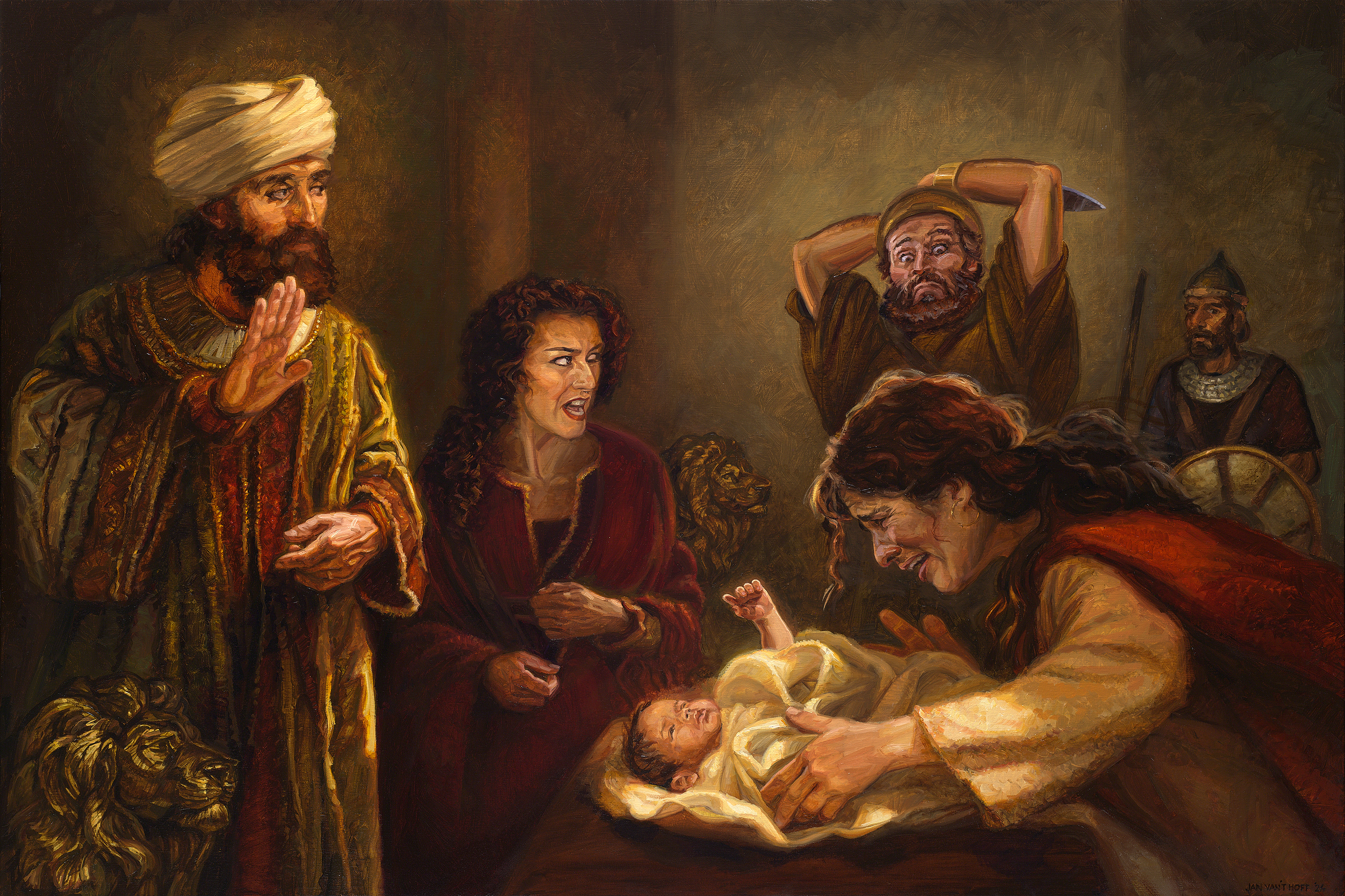 Cuando el rey ordena que el niño vivo sea cortado en dos y que se entregue la mitad a cada mujer, la verdadera madre le ruega al rey que no mate al niño bajo ninguna circunstancia, sino que se lo entregue a la otra mujer. La otra mujer dice: "¡Córtalo por la mitad!"
