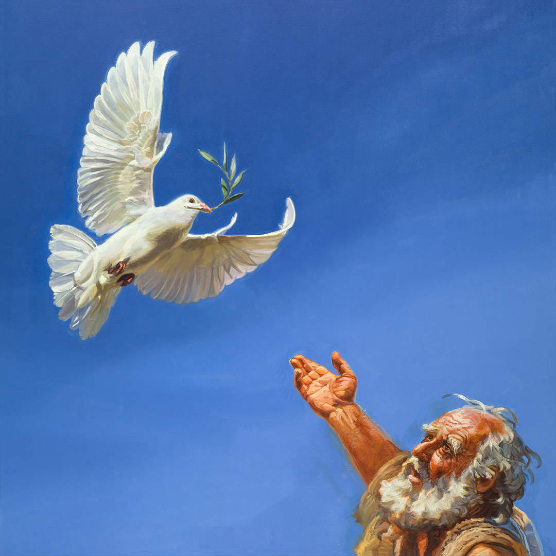 Una semana después, Noé suelta la paloma por segunda vez. Ahora la paloma regresa con una hoja de olivo fresca.