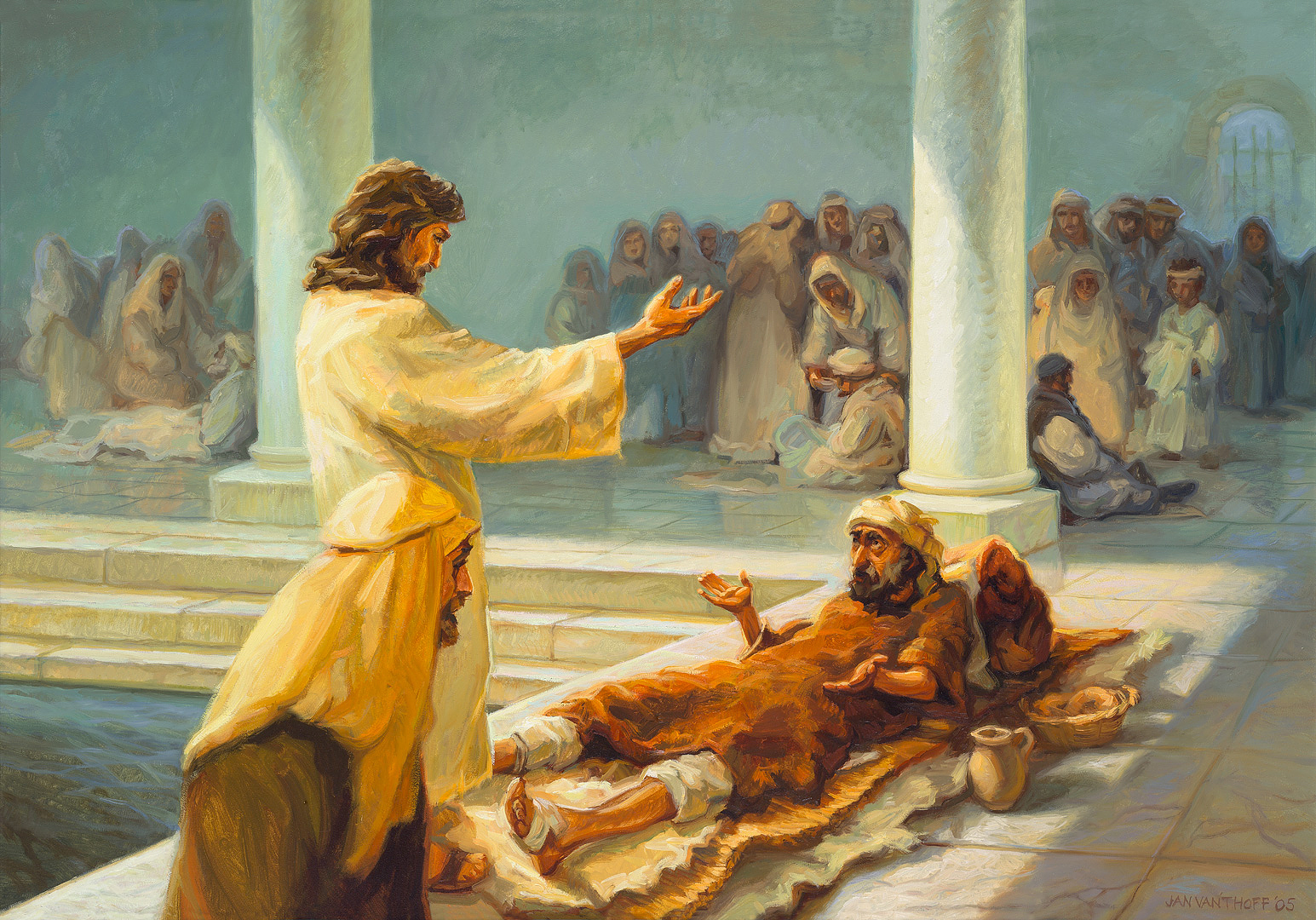 En Juan 5 está la historia de un hombre que ha estado enfermo en cama durante 38 años. Se encuentra en una de las columnatas junto al estanque llamado 'Betesda' cerca de la puerta de las ovejas en Jerusalén. Junto con muchos otros enfermos, ciegos, lisiados y paralíticos. De vez en cuando un ángel desciende al agua del estanque y la remueve. El que se meta como primero en el agua estará sano. Jesús ve al enfermo tirado allí y le pregunta si quiere ser curado. El enfermo le dice a Jesús que no tiene quien lo tire al agua del baño. Jesús le dice al hombre: “Levántate, toma tu camilla y anda.” Inmediatamente el hombre se recupera, toma su camilla y comienza a caminar.