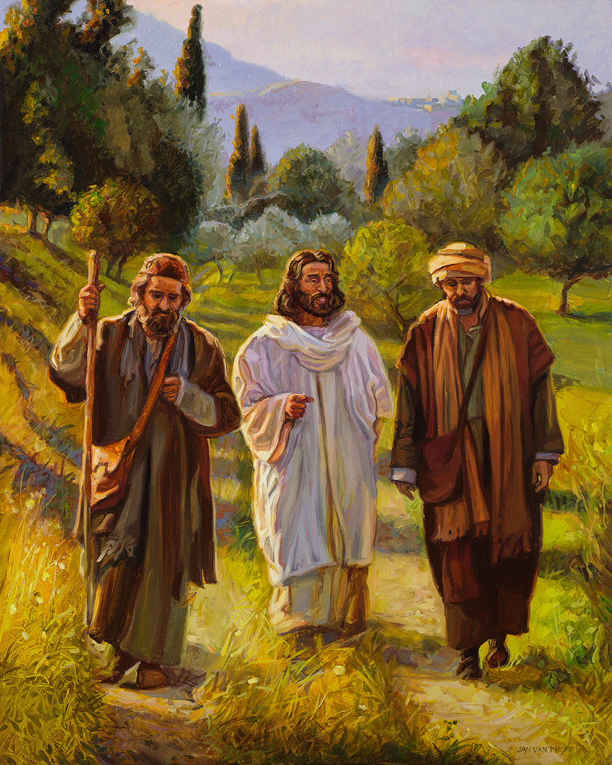 Dos de ellos van camino a Emaús, un pueblo a unos once kilómetros de Jerusalén. Los dos seguidores aún no están seguros de la resurrección de Jesús y hablan entre ellos sobre eventos recientes.
