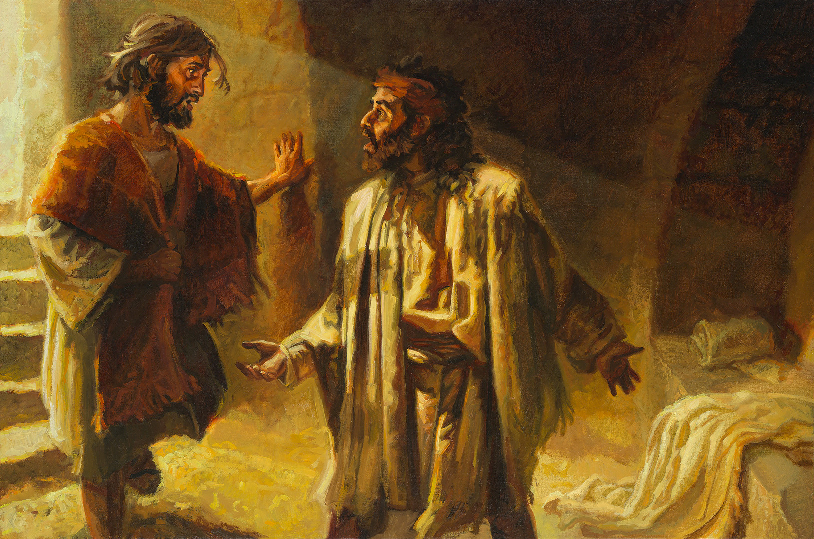 Cuando Pedro y Juan oyen esto, inmediatamente van a la tumba. Juan llega primero, pero Pedro entra como primero al sepulcro. Como testigos silenciosos de la resurrección de Jesús, yacen las lienzas en las que fue envuelto el cuerpo muerto de Jesús.