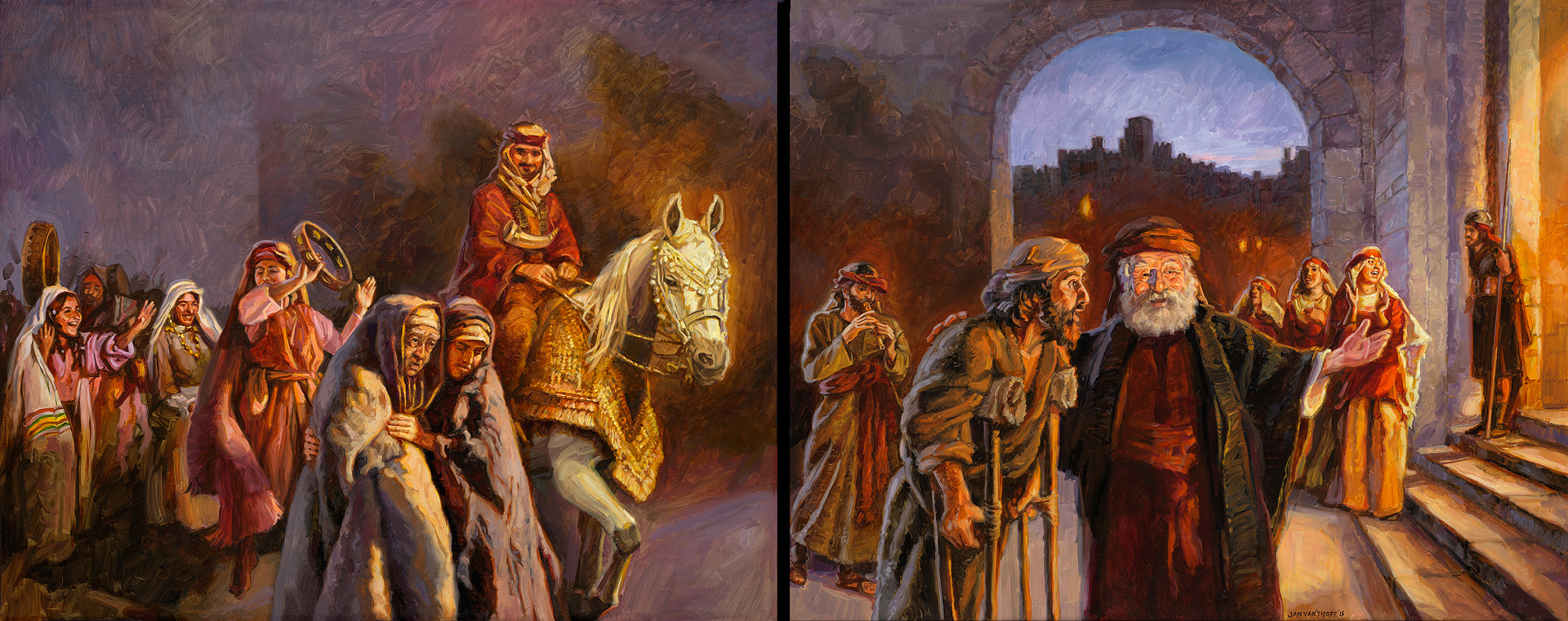 El anfitrión se enoja y envía a sus sirvientes a las calles y cruces de caminos para invitar al banquete / a la boda a todos los que encuentran: mendigos, malformados, ciegos, paralíticos, malas y buenas personas.