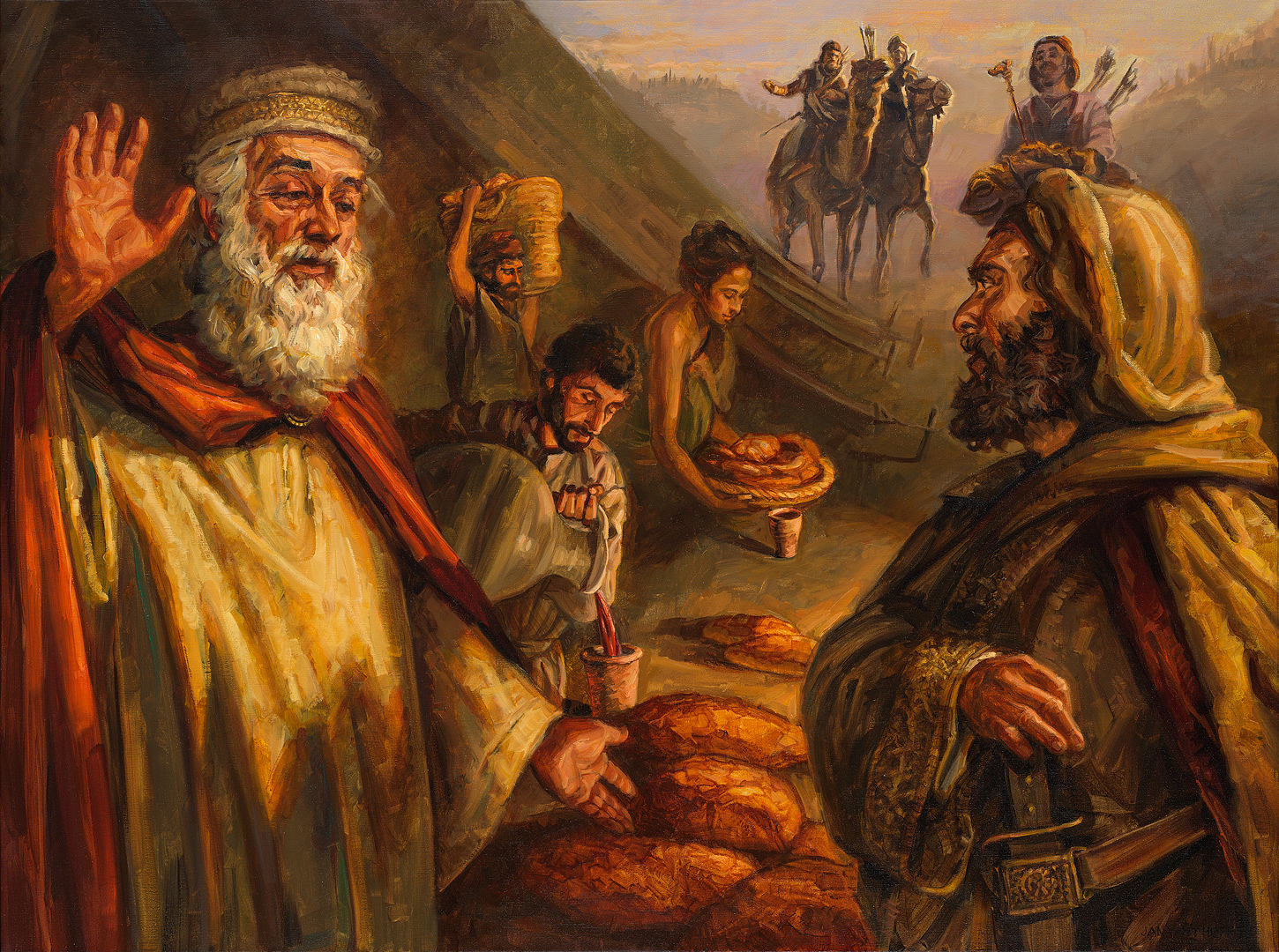 Cuando Abram regresa de la guerra, Melquisedec, ("rey de justicia") rey de Salem, viene a su encuentro con pan y vino. (Salem, que significa "paz", es la Jerusalén posterior).