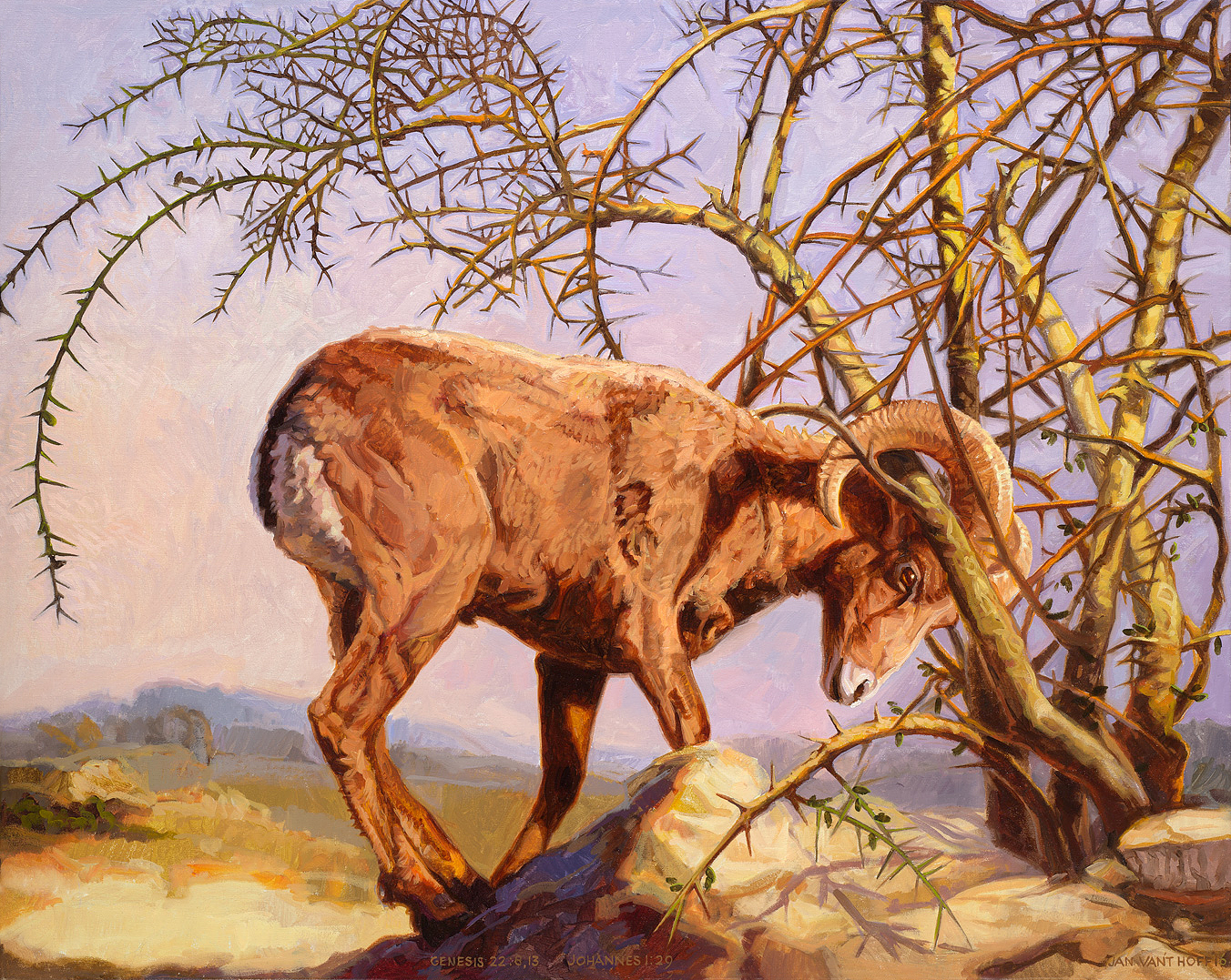 Entonces alzó Abraham sus ojos y miró, y he aquí a sus espaldas un carnero trabado en un zarzal por sus cuernos; y fue Abraham y tomó el carnero, y lo ofreció en holocausto en lugar de su hijo.