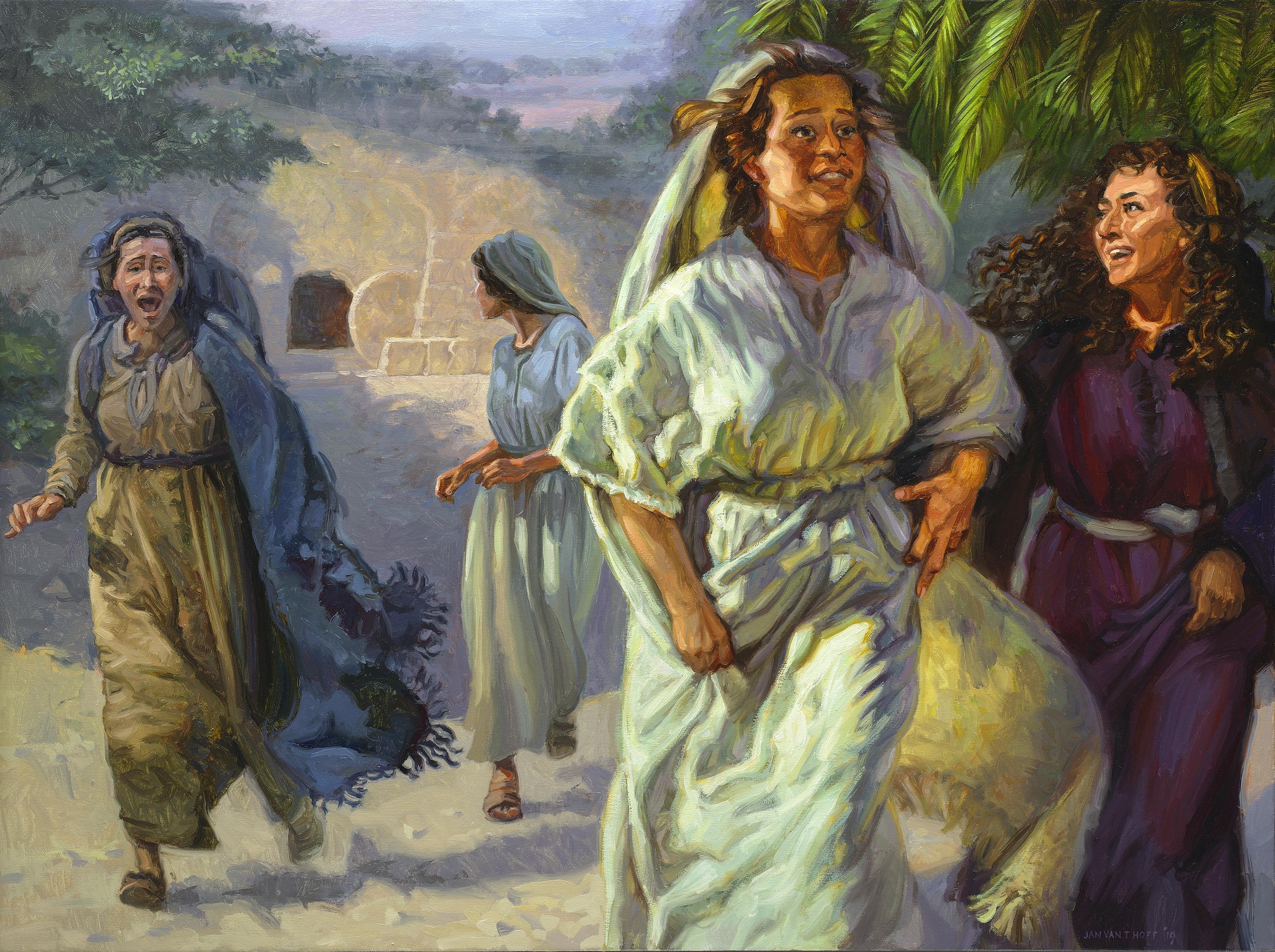 Entonces ellas, saliendo del sepulcro con temor y gran gozo, fueron corriendo a dar las nuevas a sus discípulos. Y mientras iban a dar las nuevas a los discípulos