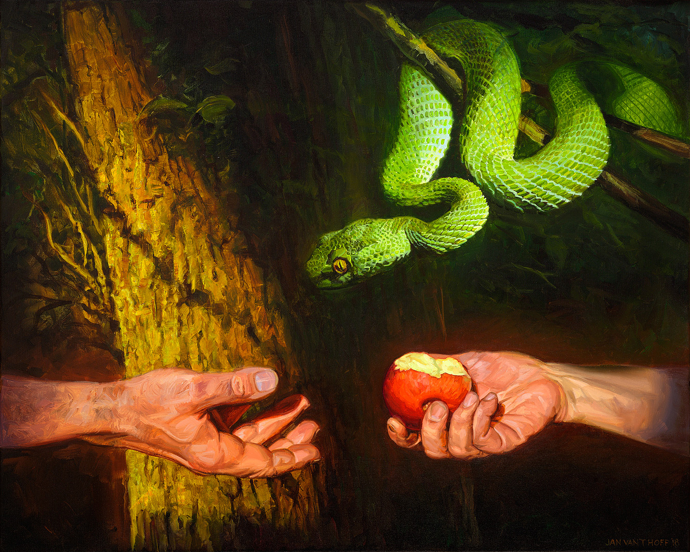 Dios les dijo a Adán y Eva que no comieran de ese árbol o morirían. A través de una serpiente habla Satanás, el diablo, y tienta a Eva para que coma la fruta prohibida. Satanás cuestiona la prohibición de Dios y le hace una seductora promesa a Eva: si comes de ese árbol, serás como Dios, y ciertamente no morirás.