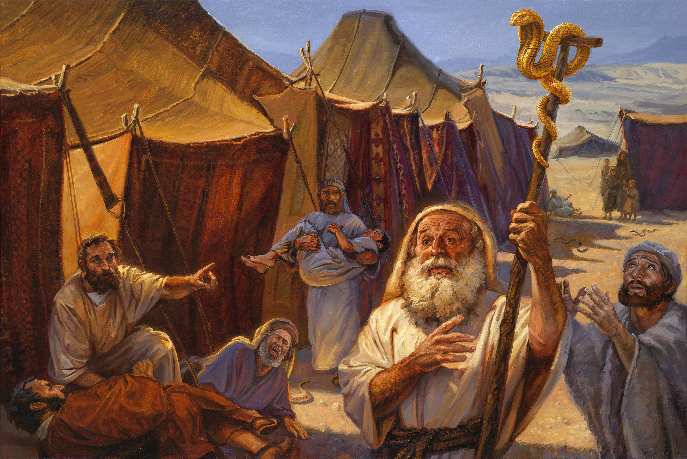 El pueblo se arrepiente y Moisés ora por el pueblo. En respuesta, el Señor da un medio para mantenerse con vida después de una mordedura de serpiente. Moisés hará una serpiente de bronce y la pondrá en un madero en un lugar alto, para que cualquiera que sea mordido pueda verla. Si una serpiente venenosa muerde a una persona y luego mira a la serpiente de cobre, vivirá.