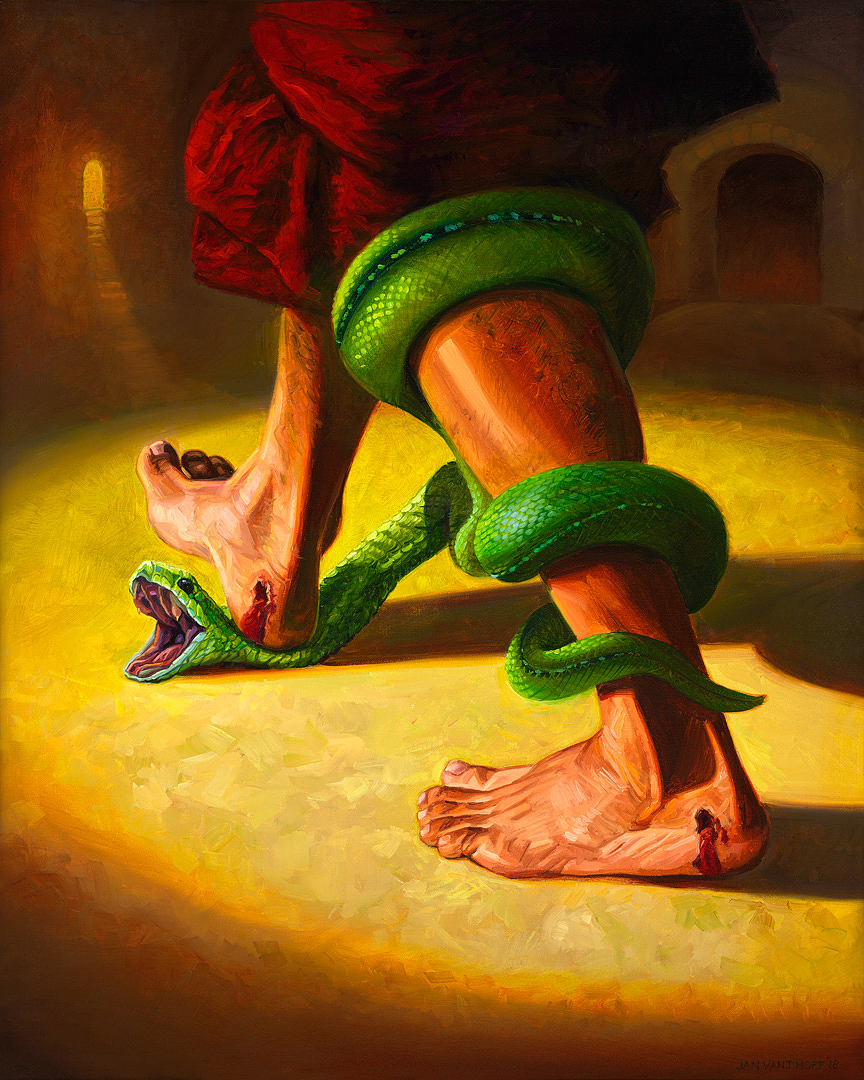 En esta pintura simbólica, Jesús aplasta la cabeza de la serpiente, el animal que simboliza a satanás. Esta promesa en Génesis fue cumplida por Jesús en la cruz del Calvario. En la pintura se pueden ver las heridas en sus talones.