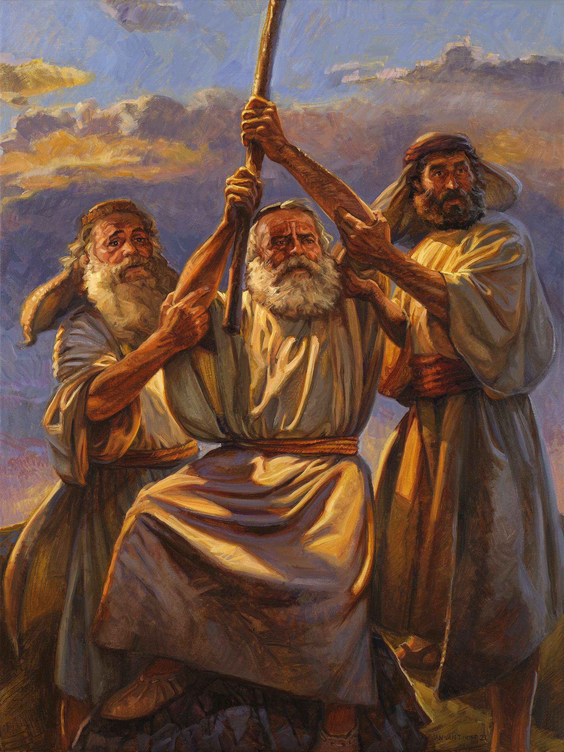 Cuando Moisés, fatigado, baja sus manos que sostienen el bastón, los amalecitas ganan la partida. Aarón y Hur ayudan a Moisés a levantar la vara. Entonces los israelitas derrotan a Amalec.