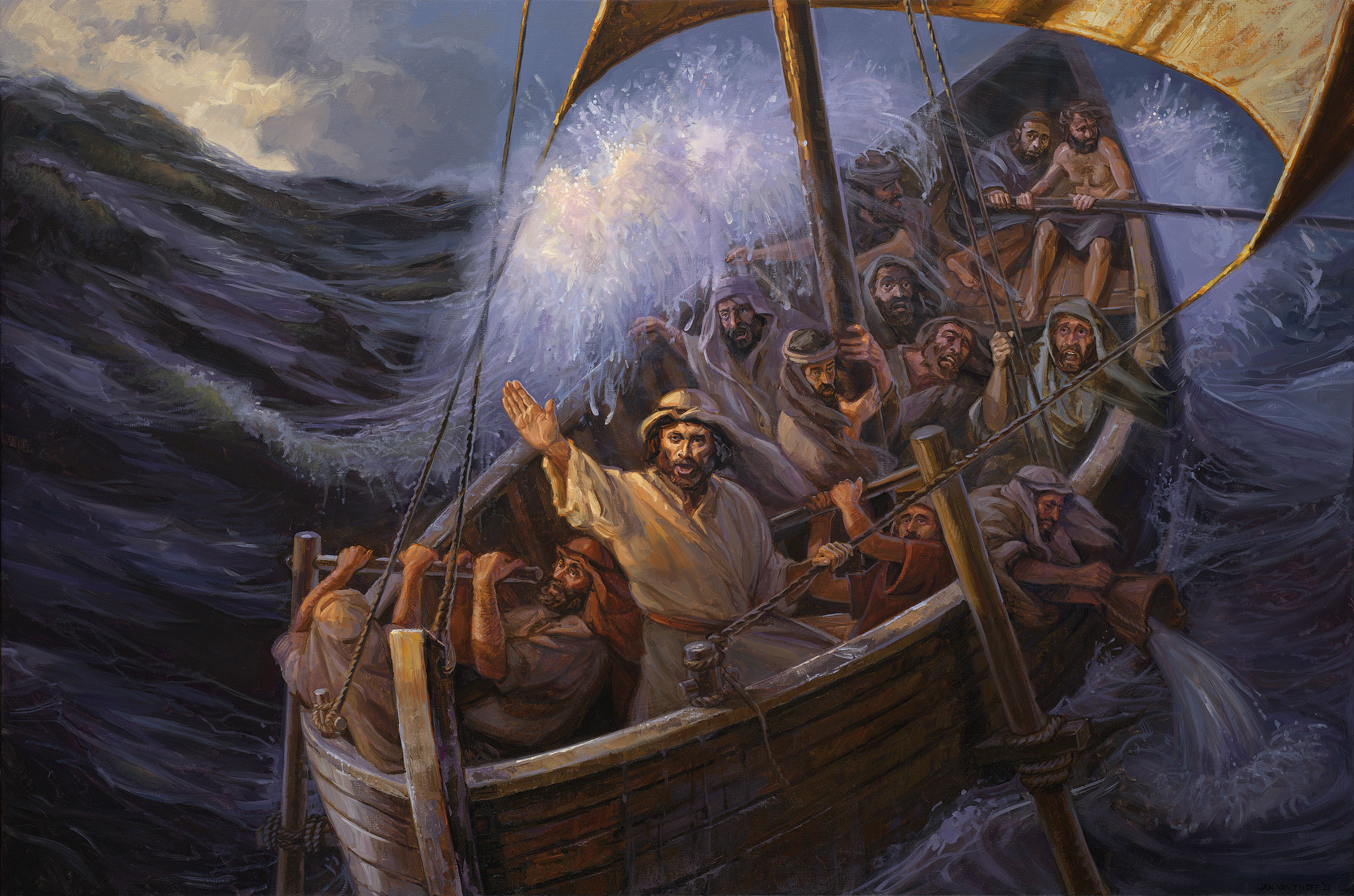 Entonces se levantó una gran tormenta. Los discípulos, que eran pescadores de oficio y estaban familiarizados con la situación en el lago, no pueden evitar que el barco se hunda.